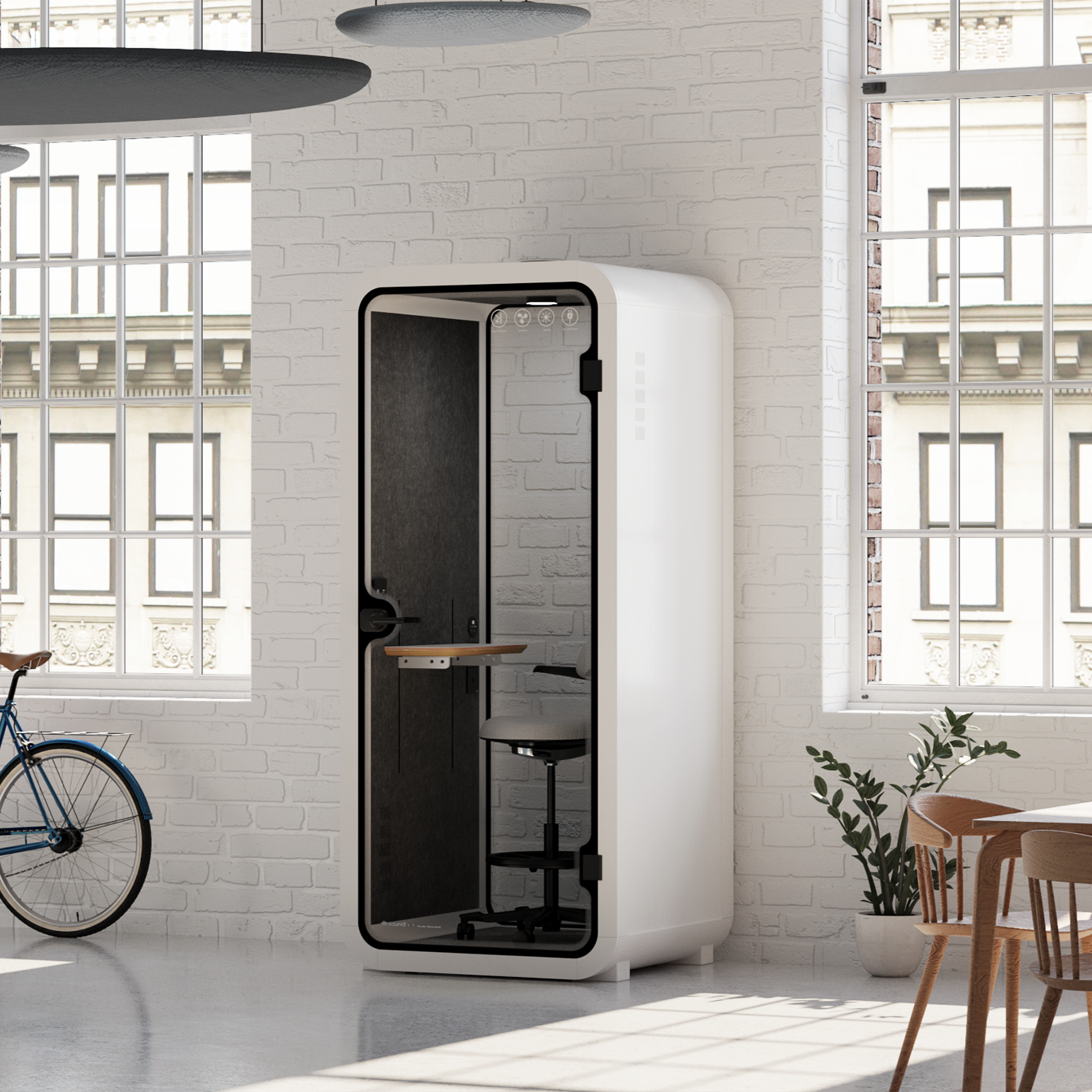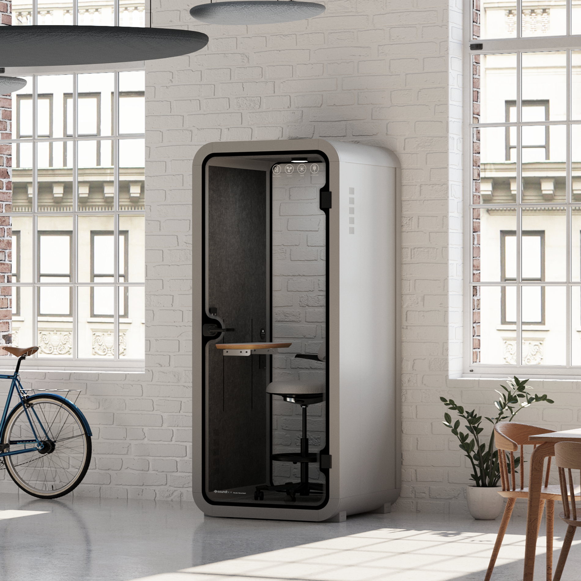 Men det är inte allt - vi erbjuder mer än bara ergonomiska skrivbord. Våra akustiska telefonbås är utformade med noggrann uppmärksamhet på detaljer. Tillverkade med hjälp av aluminium för flygkvalitet och har en tjock glasdörr och bakpanel som påminner om tågvagnsglas, är dessa telefonbås byggda enligt de högsta standarderna.
